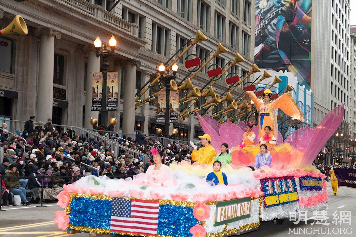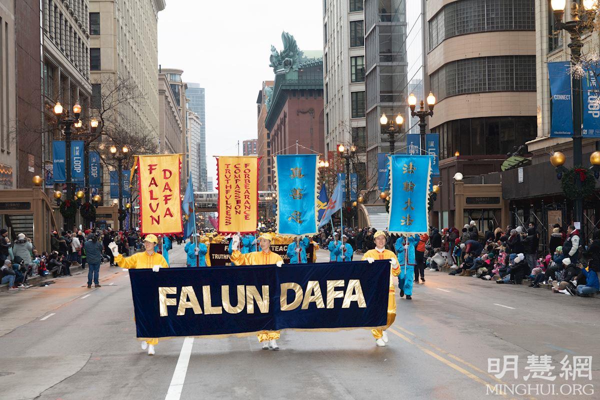 自二零零三年开始,法轮功学员几乎年年参加芝加哥圣诞游行。今年游行活动的主持人用两分钟介绍法轮大法,他们以“壮观”来形容法轮大法队伍,称赞法轮大法音乐祥和美好,最后主持人说:“世界需要真善忍!”