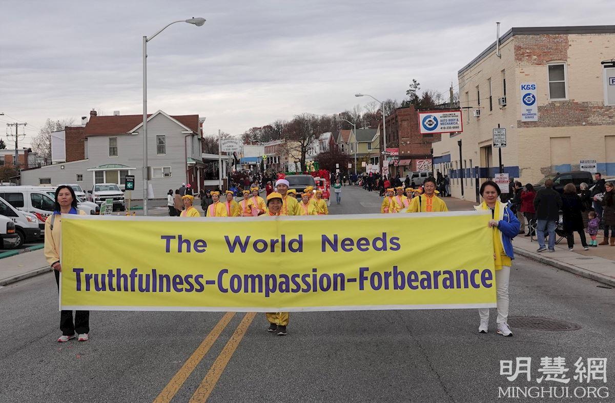 二零二一年十二月五日,美国马里兰州最大城市巴尔的摩举办圣诞节游行,一百六十个团体参加,法轮功队伍是其中之一,数万现场民众观看。第一次看到法轮功学员游行队伍的民众说,他们把美妙的能量带到巴尔的摩,真、善、忍正是当下这个世界所需要的。