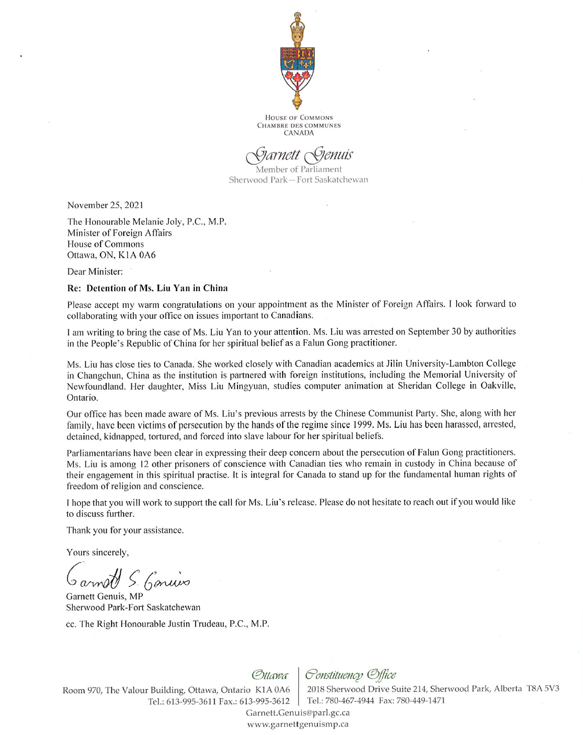 他说:“今年九月三十日,刘女士因为法轮功的精神信仰,被中国当局非法逮捕。刘女士和加拿大有着密切联系。她曾在长春的吉林大学-兰博顿学院就职,并和来自加拿大纽芬兰纪念大学的同行紧密协作。她的女儿刘铭园目前在Oakville的Sheridan College动画专业就读。我得知刘艳女士和家人从一九九九年以来,屡次由于精神信仰而遭遇骚扰,关押,绑架,酷刑,以及胁迫从事奴工。国会议员们一直对法轮功被迫害的议题深表关切。至今,仍有12名加拿大居民及公民的家人亲友因为信仰问题而在中国身陷囹圄。加拿大必须捍卫宗教信仰自由这样的基本人权。我希望您能为刘艳女士重获自由而发声呼吁。”