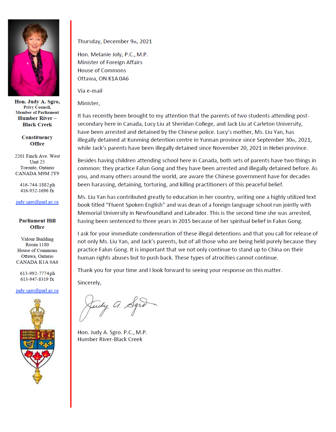 十二月九日,另一位国会法轮功之友联合主席,国会议员斯格若(Judy Sgro)在得知刘之源、刘铭园父母的遭遇后,向总理特鲁多发电子邮件,要求总理立即谴责对法轮功学员的非法拘禁,“不仅要求释放刘艳女士和刘之源的父母,而且要求释放所有纯粹因为修炼法轮功而被关押的人。重要的是,我们不仅要继续反对中国(中共)侵犯人权,还要予以反击。这类暴行不能继续。”