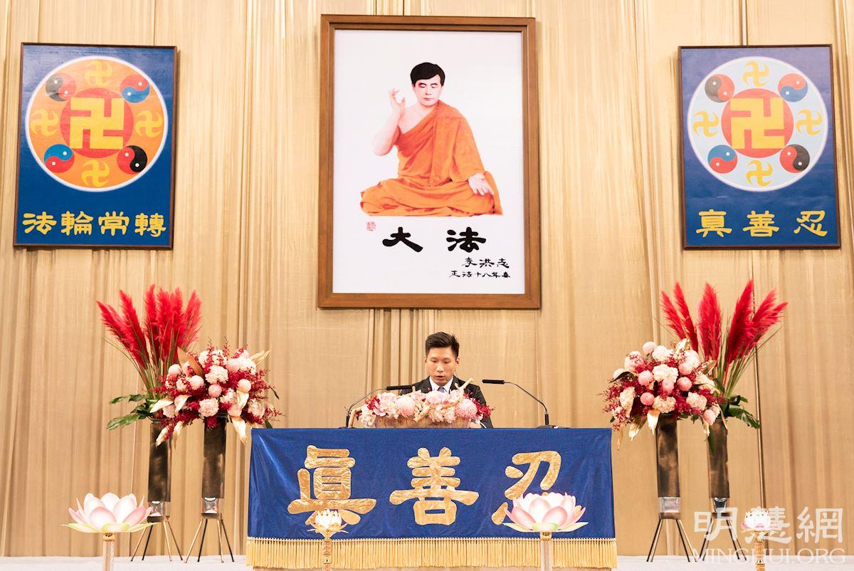 法会现场隆重庄严,师父法像高悬中央,“真、善、忍”和“法轮常转”[1]的法轮图形悬挂左右。会场的正上方写着“2021法轮大法台湾修炼心得交流会”,长达数米的金字竖幅──“慈悲能溶天地春 正念可救世中人”[2]悬挂在主席台两侧。这次法会共有十九位学员发言,交流自己在各种领域实修心性、用心救人的体悟与感受,令与会者深受触动。