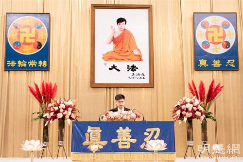 法会现场隆重庄严,师父法像高悬中央,“真、善、忍”和“法轮常转”[1]的法轮图形悬挂左右。会场的正上方写着“2021法轮大法台湾修炼心得交流会”,长达数米的金字竖幅──“慈悲能溶天地春 正念可救世中人”[2]悬挂在主席台两侧。这次法会共有十九位学员发言,交流自己在各种领域实修心性、用心救人的体悟与感受,令与会者深受触动。