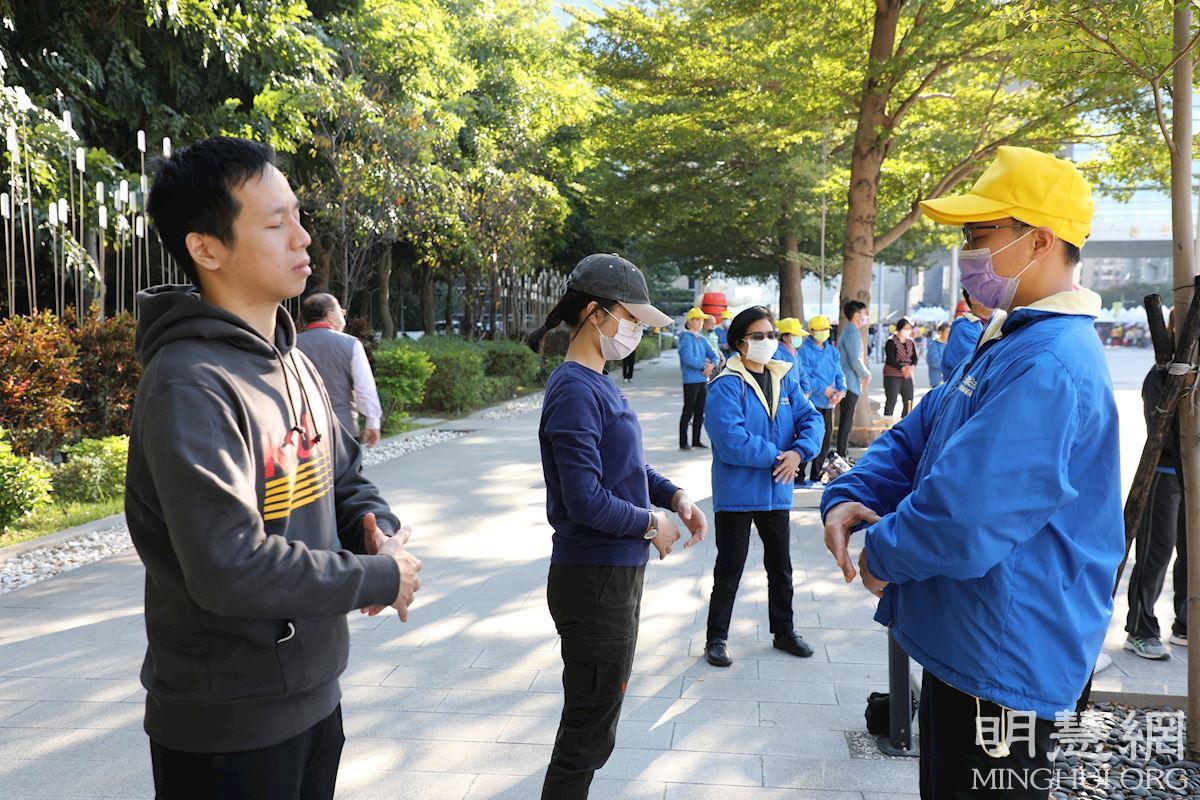 当日冬阳暖照,台湾大道上熙来攘往的车流与广场上祥和的炼功画面形成对比,吸引过往的行人驻足拍照,也有在一旁观看的民众跟随比划起动作来。学员向过往的行人派送资料、介绍法轮功,同时征签声援法轮功反迫害。