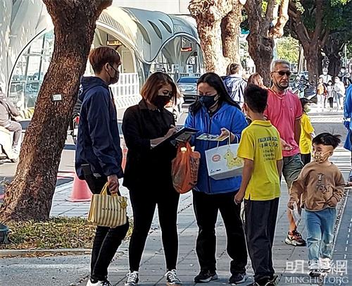 当日冬阳暖照,台湾大道上熙来攘往的车流与广场上祥和的炼功画面形成对比,吸引过往的行人驻足拍照,也有在一旁观看的民众跟随比划起动作来。学员向过往的行人派送资料、介绍法轮功,同时征签声援法轮功反迫害