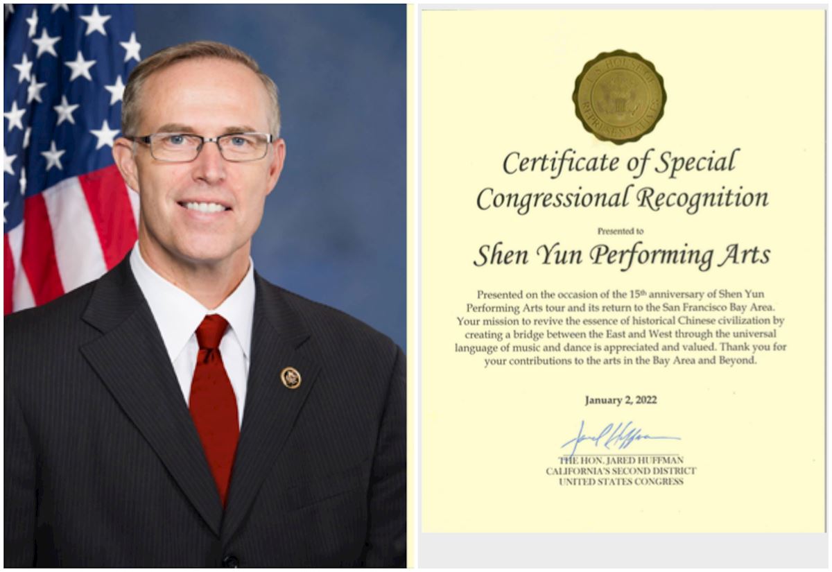 图6:加州国会众议员贾里德·赫夫曼(Jared Huffman)褒奖神韵再临加州旧金山湾区演出。(明慧网合成图片)