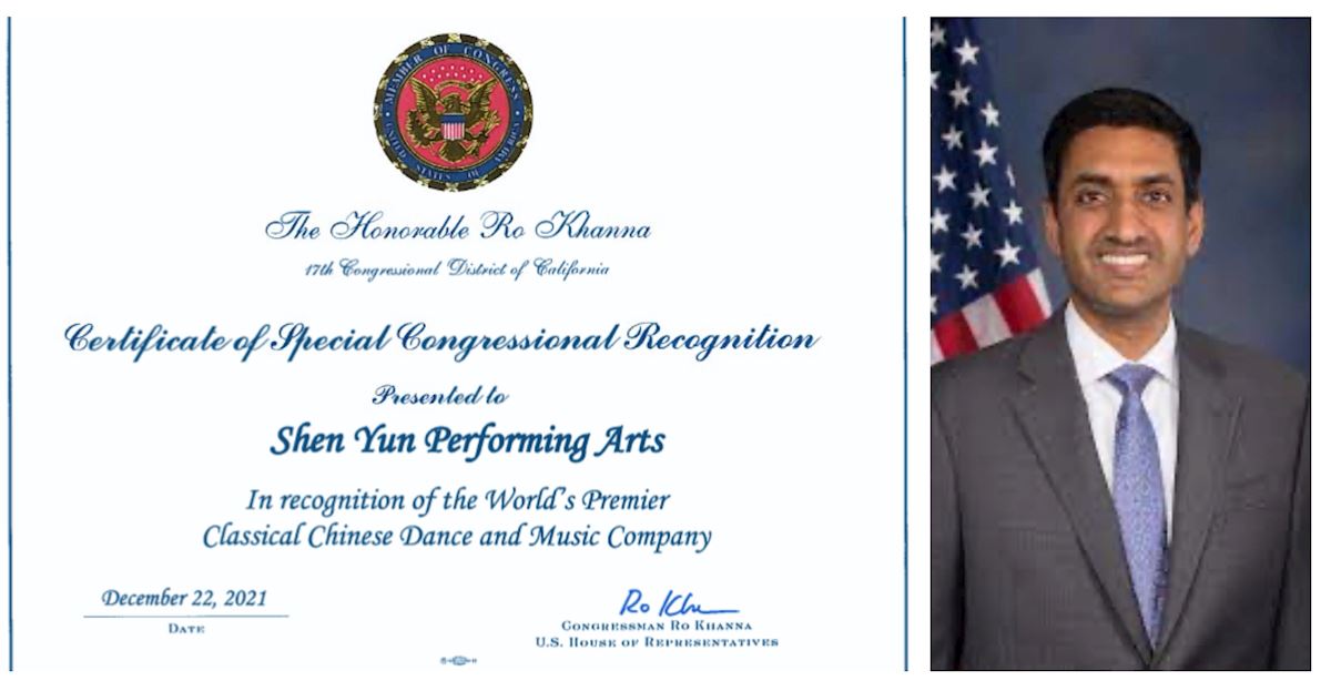 图7:国会众议员罗·卡恩纳(Ro Khann)在褒奖中,表彰“神韵艺术团是世界首屈一指的中国古典舞和音乐艺术团。”(明慧网合成图片)