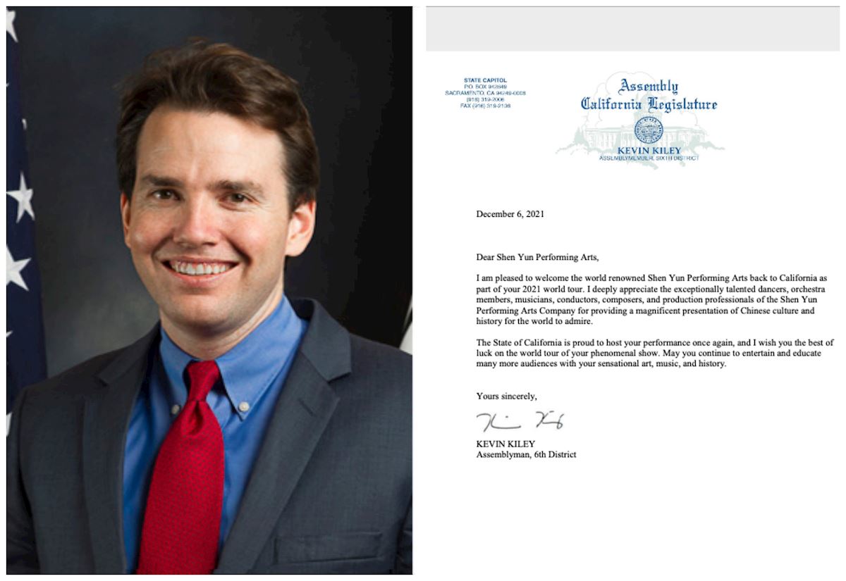 '图8:加州众议员凯文·基利(Kevin Kiley)在贺信中说,欢迎世界著名的神韵艺术团重返加州。(明慧网合成图片)'