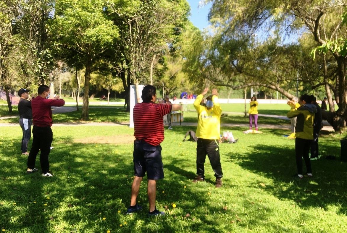 ![]() 图1:二零二一年十二月二十六日,法轮功学员在厄瓜多尔首都基多的卡罗琳娜公园集体炼功,民众加入学炼动作。 |