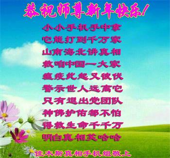 我们知道现在是天灭中共的最后时刻,我们惦念和我们有缘的亲友,我们想办法以不同方式告诉了他们真相,让他们也能明白的得救。我们知道做的还不够,会继续努力。这里我们感谢师尊救度!恭贺师尊新年好!