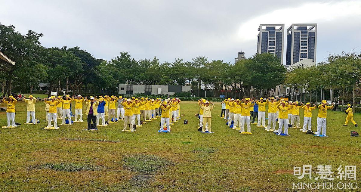 图:二零二一年十一月二十八日下午,部份桃园法轮功学员在龙潭运动公园集体炼功,传播法轮功的真相。