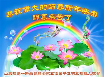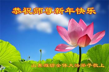 山东省潍坊大法弟子恭祝慈悲伟大的师尊新年快乐!在新的一年里,弟子一定要多学法,向内修,向内找,修好自己,做好三件事。