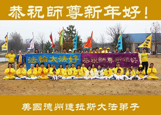 美国德州达拉斯-沃斯堡地区的法轮功学员十二月二十六日在布兰诺市的罗素溪公园湖畔集体炼功,向法轮功创始人李洪志先生恭贺新年!