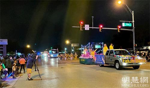 当天游行有一百多个团体参与,游行队伍浩浩荡荡,加上热情的观众,与大道两旁的树上、建筑物上装饰的彩灯,相互辉映,火树银花照亮了深蓝色的天空,整个葡萄藤市的市区被人群和无数灯光所覆盖,处处洋溢着欢快的节日气氛。