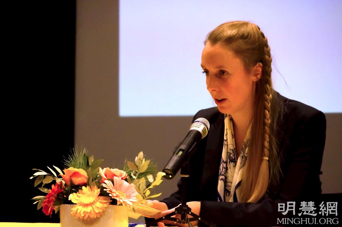 ![]() 图5:瑞士女子安雅在台上发言谈到,自己曾误信中共对法轮功的谎言诽谤;后来了解真相后,才知道大法好,读了《转法轮》后,有如回家的感觉。 |