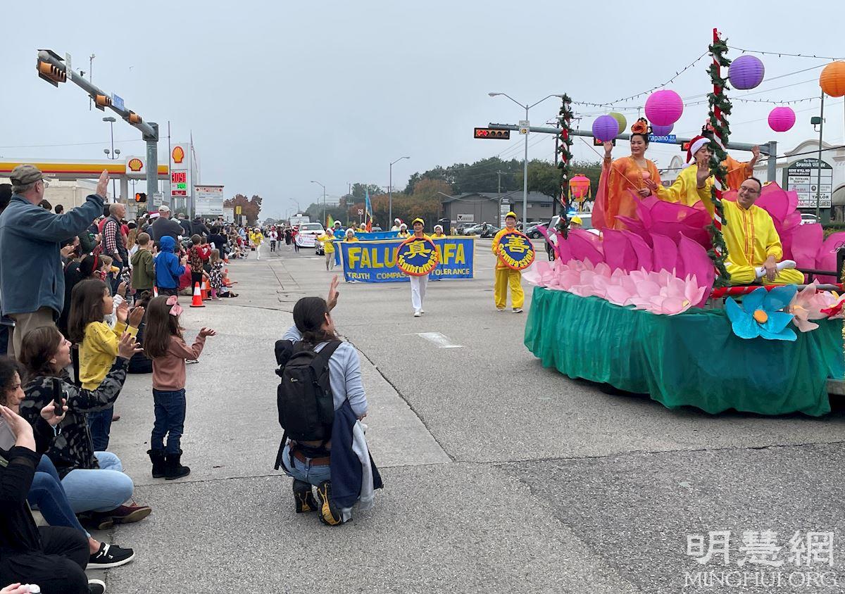 法轮功学员自己搭建的花车以莲花为造型和装饰,身着金黄炼功服的学员在车上演示功法,再加上古装侍女,他们所到之处都引来人们的惊叹,“太美了!”“太漂亮了!”学员们举着写有“法轮大法、真善忍”、“法轮大法好”等色彩明亮的横幅,许多人很感兴趣,想了解,高兴地接过学员递过来的传单,还有人马上就来模仿学员的炼功动作。
