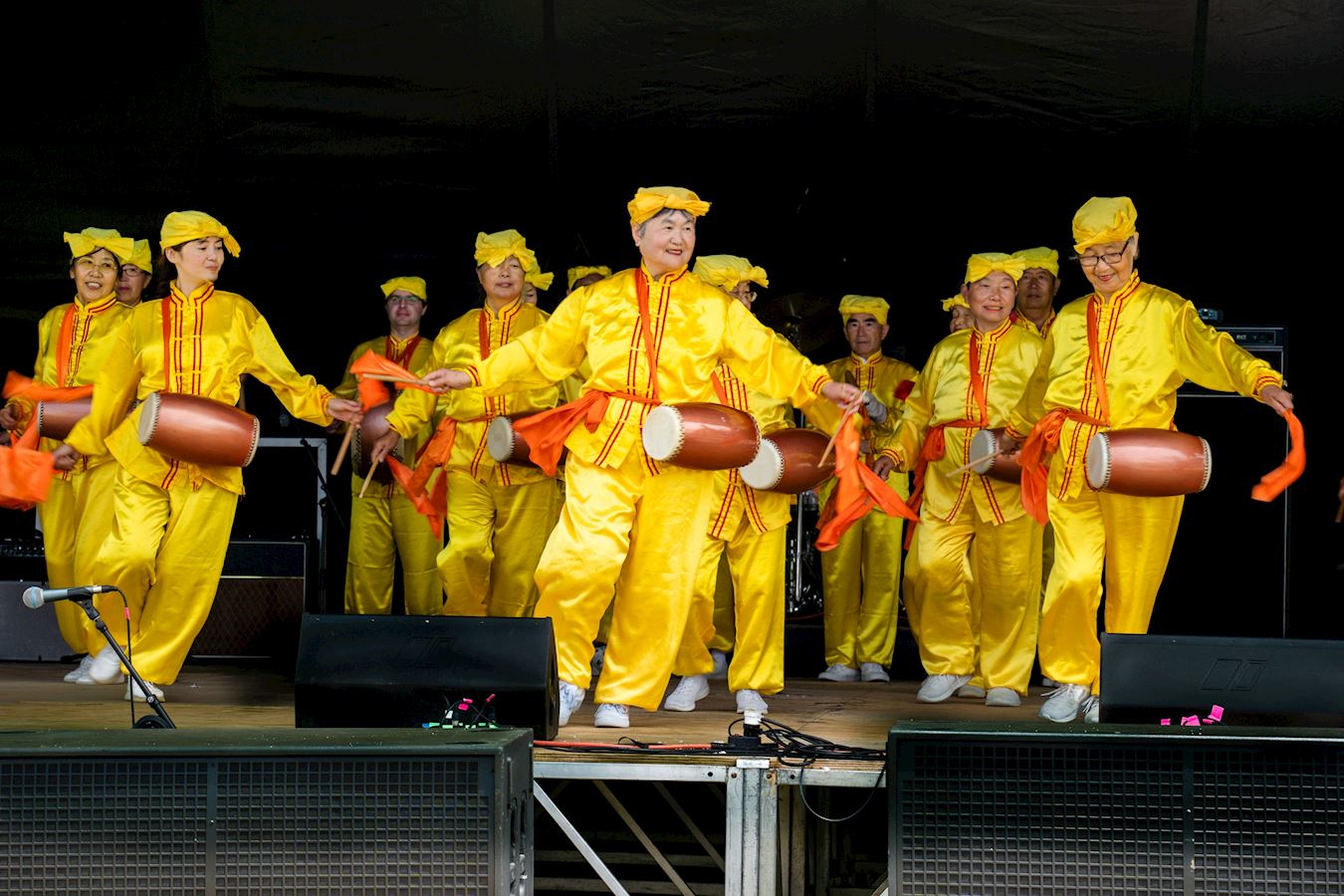 由新西兰法轮功学员组成的天国乐团和腰鼓队受到国庆日庆典主办机构的邀请,在当天的主舞台上表演。天国乐团吹奏了“法轮大法好”、“神圣的歌”、“凯旋”等曲目,腰鼓队表演了“新中国进行曲”、“三退保平安”和“法轮大法好”等舞蹈。表演前,国庆盛典主持人介绍了法轮功的功法和理念,还讲述了中共对法轮功长达二十一年残酷迫害的情况。