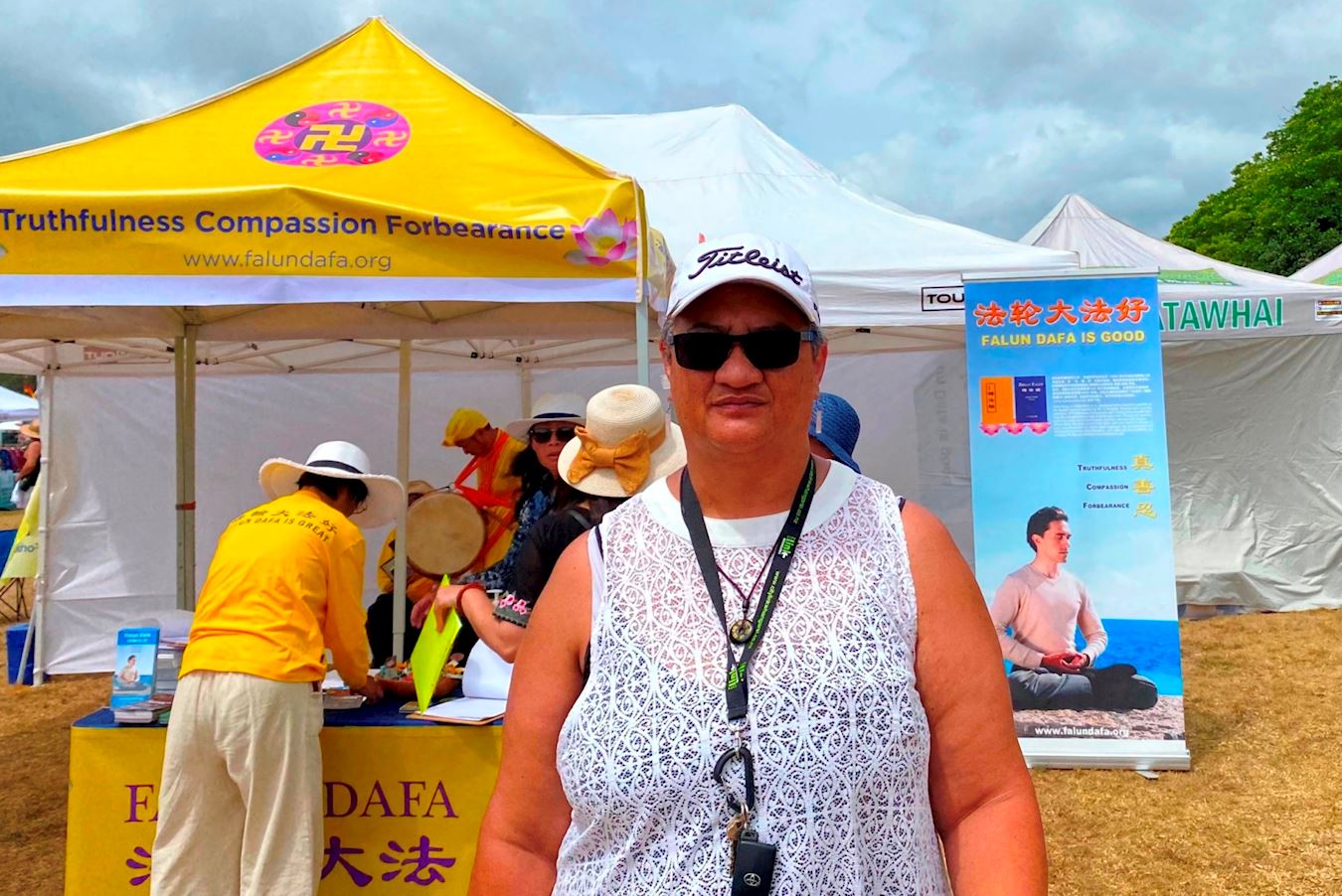 麦克斯·库帕(Max Cooper)是一位酒店的主管,她来到介绍法轮功的展位,表示非常感兴趣。她说:“我喜欢打坐,我们毛利族裔有着很相似的理念,我们非常相信能量、精神、灵性这些方面的东西。这是神给予人最为精华的东西。我们只是表达的语言、实践的方式不同而已。我们毛利人非常崇尚精神层面上的东西,我们向创世主祈祷。这不是宗教,也不是人的身体或者思想领域的东西,而是存在于另外时间和空间的。”