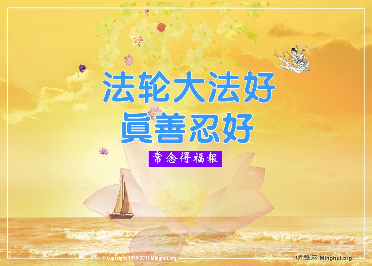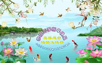 大法法光普天照 救度众生得福报 大法弟子更精進 艰难岁月见真心 以法为师心更明 只有救人路走正 得救众生谢师尊