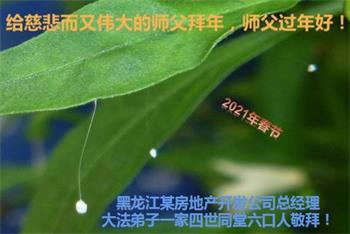 师恩浩荡!我家十二口人,有的已经得法,有的尚未修炼但都很支持大法。值此新年来临之际,我们全家人的共同的心声是:向师父问好,给师父叩首拜年!以表达我们全家人对师尊的无尽的感恩!