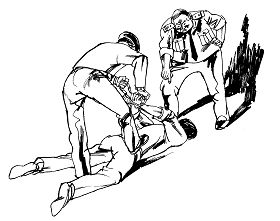 酷刑示意图:苏秦背剑:把人的双手臂背在后面用手铐铐住,恶警抓住铁链踩住法轮功学员后背,用力往上拽,痛苦至极。