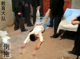 “罚坐”:上身坐直,赤足双脚伸直,坐在院坝里,双手掌心贴地。洗脑班天天放谤法噪音,强迫法轮功学员看谤法的电视、资料,威逼写不炼功的保证。不从的被暴打、不穿鞋袜光脚在院坝的水泥地上跑圈,甚至还逼迫抱四、五十斤的大石头跑。