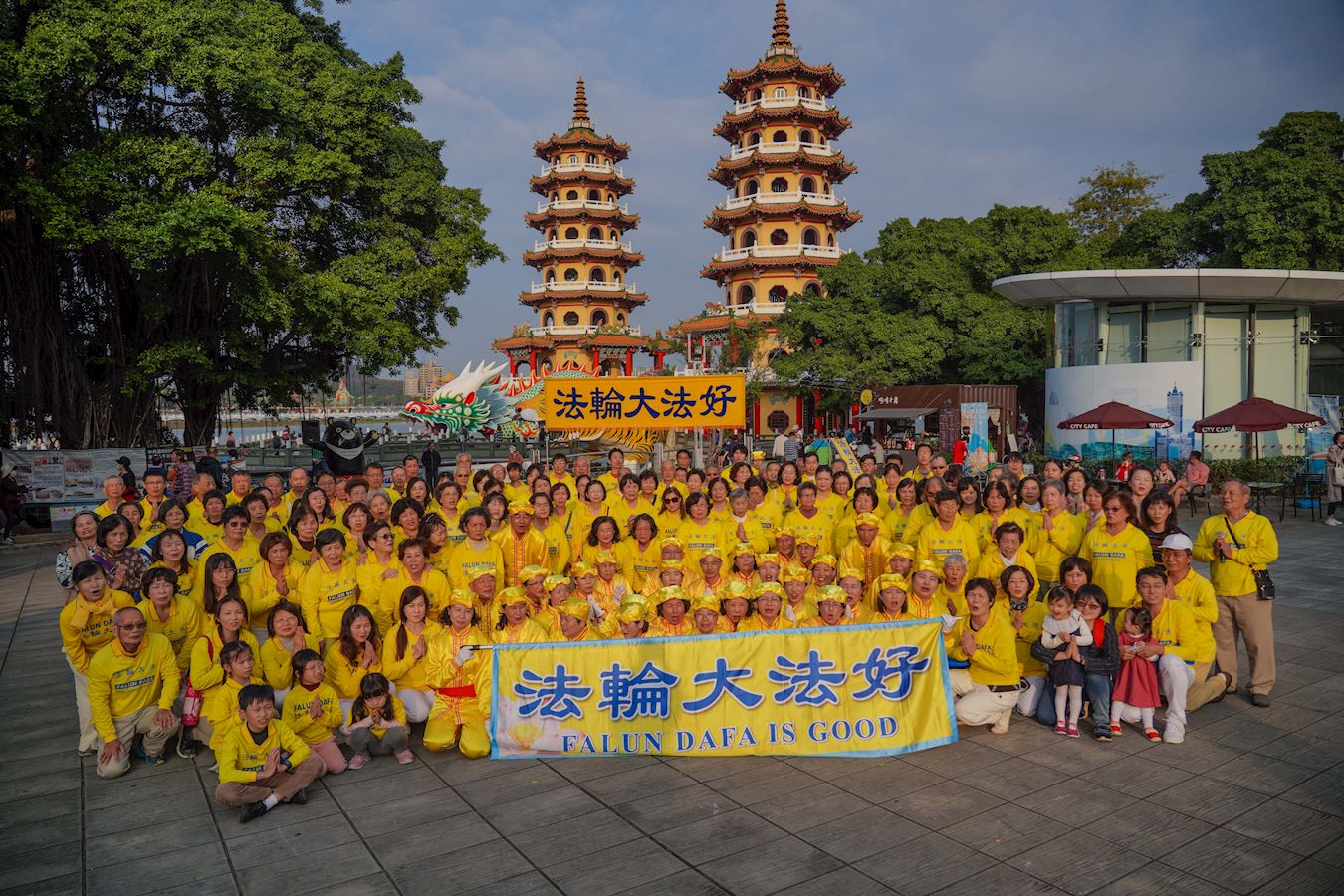 '图1~2:二零二一年一月三十一日周日下午,高雄部份法轮功学员于著名旅游景点“莲池潭龙虎塔”边广场炼功弘法,并于中国新年前夕恭祝师尊新年好。'