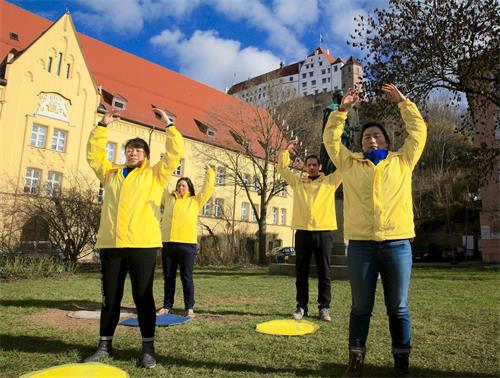 '图1:德国法轮功学员于二零二一年二月二十八日,在南部巴伐利亚的兰茨胡特城(Landshut)的三位一体广场(Dreifaltigkeitsplatz)举办信息日活动。'
