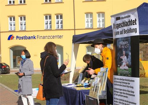 一对大约五十岁的夫妇仔细观看了法轮功学员摆放的法轮功功法介绍、中共迫害法轮功和解体中共等展板。法轮功学员安德里亚斯(Andreas)跟他们介绍了法轮功的功法、中共对法轮功迫害的状况。先生在制止中共摘取法轮功学员器官和解体中共的签名簿上签名。
