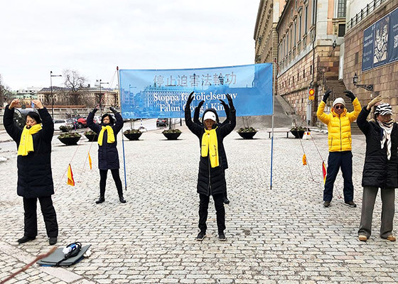 三月二十日,法轮功学员在瑞典首都国会大厦旁的钱币广场向过往路人介绍什么是法轮功,以及法轮功学员在中国遭受迫害的事实真相。
