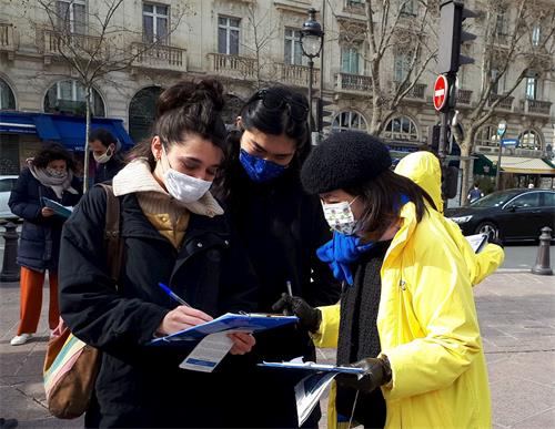 【明慧网二零二一年三月二十四日】(明慧记者周文英巴黎报道)二零二一年三月二十一日星期日下午,在巴黎圣米歇尔广场,法轮功学员举办了炼功、讲真相和征集签名反迫害的活动。虽是禁足隔离时期,仍有不少路人驻足了解详情,并表达了对中共暴行的愤慨,认为对法轮功的迫害是对人类尊严的侵犯。