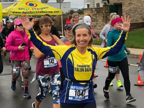 【明慧网二零二一年三月二十七日】(明慧记者伊莲采访报道)二零一八年八月四日,在美国新泽西州举行的一年一度铁人三项的比赛过程中,有一位引人注目的选手,名叫珍妮·米切尔。她身穿印有“还法轮大法自由”(Freedom for Falun Dafa)的竞赛服,最后,她赢得了65-69岁年龄组的第三名。那一年她六十七岁。