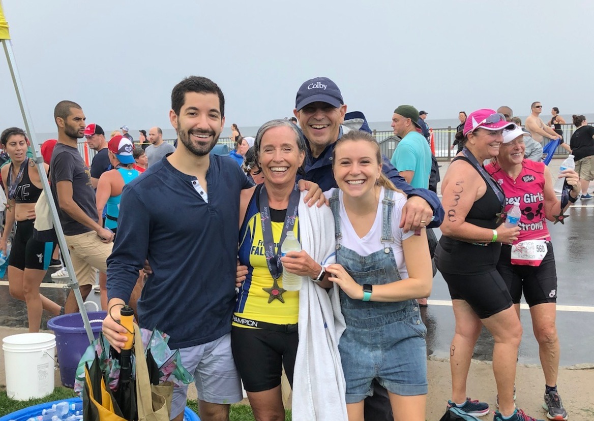 图3:珍妮·米切尔(Jeanne Mitchell,左二)在比赛终点与家人合影。