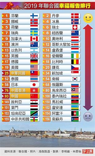 2019年3月20日联合国公布 “全球幸福报告”,根据预期寿命、收入和社会支持等指标对全球156个国家和地区进行评估,芬兰蝉联最幸福国家,台湾排名第25名,优于新加坡(34)、泰国(52)、韩国(54)、日本(58)、香港(76),中国(93)。