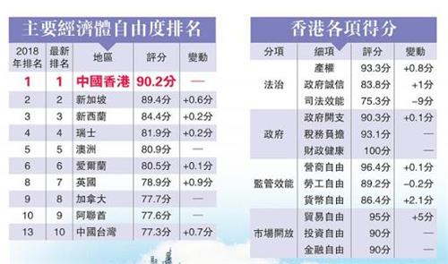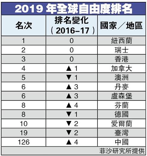 在最新的报告中,前十名依次为:新西兰、瑞士、香港、丹麦、澳大利亚、加拿大、爱尔兰、爱沙尼亚、德国和瑞典(并列第九名)。美国以8.44分的人类自由指数得分排名第17位,其中个人自由得分8.66,经济自由得分为8.22分。叙利亚、苏丹和委内瑞拉是个人自由指数排名中的最后三位。