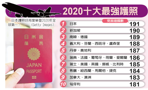 依据英国顾问公司Henley&Partners最新公布的2020年亨利护照指数,以免签191个国家和地区的优势,日本再摘全球最佳护照桂冠。新加坡以免签190个国家和地区,名列第2.韩国与德国并列第3,可免签189个国家和地区。