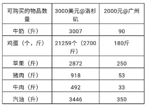 有学者豪气满满地说“在中国一月2000块钱的工资,比在美国3000美元的工资过的舒服多了”。一名曾在广州生活过现居住在洛杉矶八个月的人不信邪,和广州的亲戚同步探访物价后给出了数据。对比一看,就知道中国的生活成本太高了。