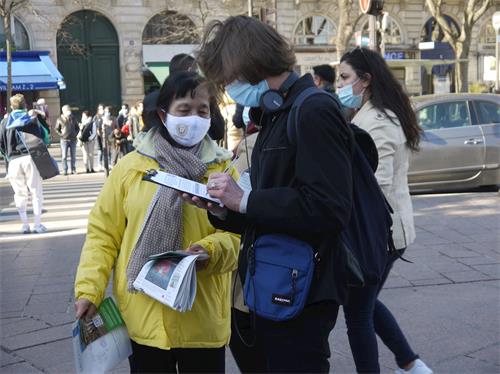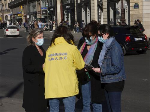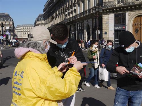 在巴黎,人们虽然白天可以自由出入,但夜间宵禁,疫情阴影仍然笼罩着这座著名的文化艺术都市。看到法轮功学员平静、祥和的炼功,人们停下脚步,有的学炼法轮功,有的索要资料、传单,了解真相。很多人在征签表上签字,抵制中共对法轮功的迫害。有的人对法轮功学员伸出大拇指,赞赏他们的行动。