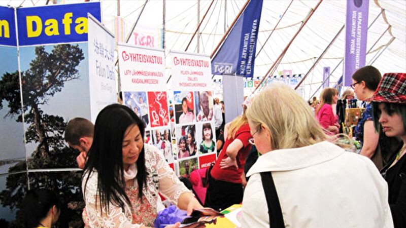 图1:朱洛新(左)在芬兰参加活动,向民众讲法轮功真相