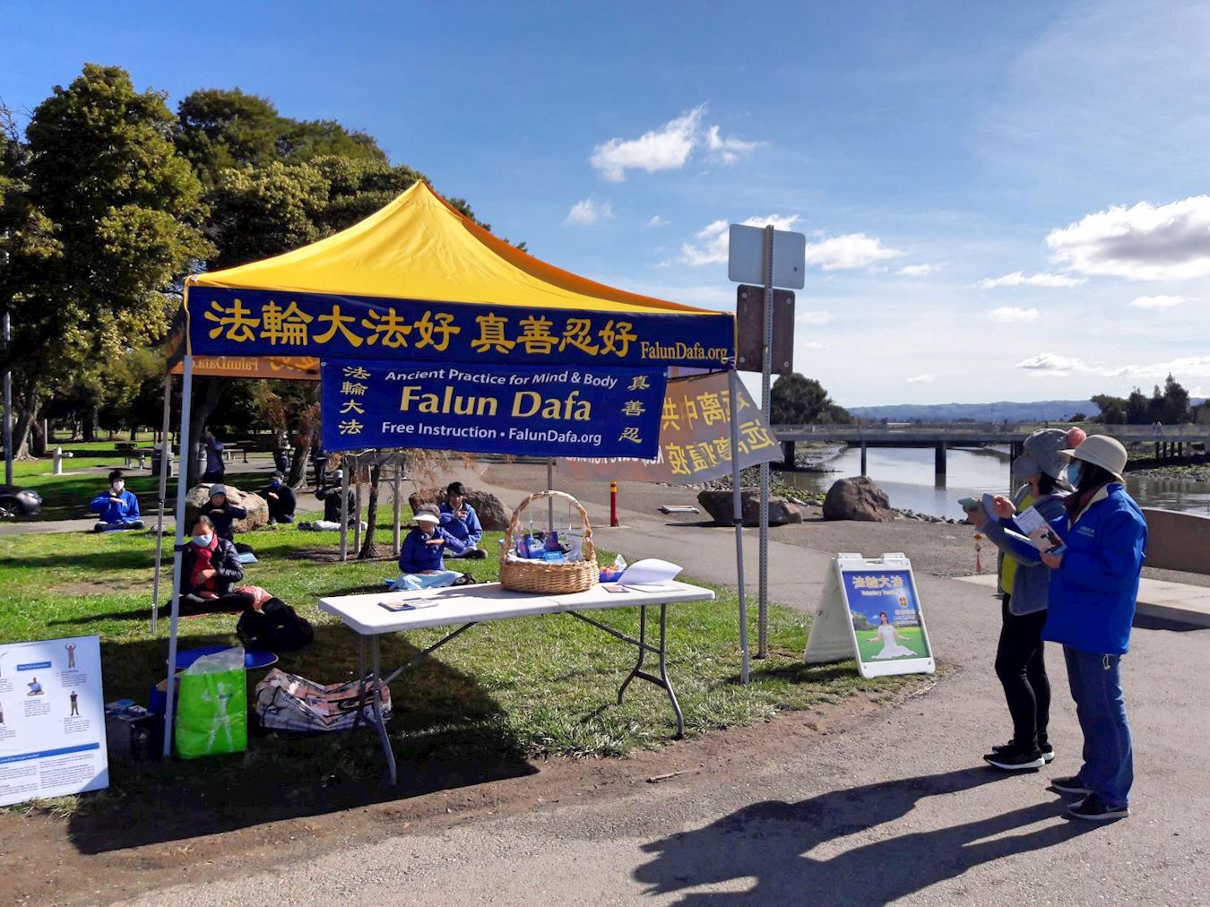 圣丽安珠市(San Leandro)的玛丽娜海边公园占地三十英亩,有长达一英里的锻炼路径和美妙海景。吸引很多当地居民到这里来散步锻炼。法轮功学员平静祥和的炼功场面,吸引着来来往往的民众驻足观看。有的接过法轮功真相资料,有的和学员长时间交谈了解更多讯息。有的还询问在哪里可以学炼法轮功,也有的当场在跟着模拟炼功动作。