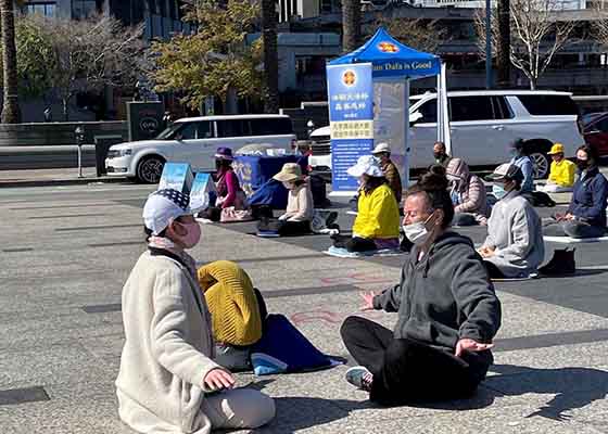 旧金山部份法轮功学员来到渡轮大厦前的广场集体炼功,告诉人们“法轮大法好,真善忍好”。有路人经过时表示感受到能量,并现场学功。