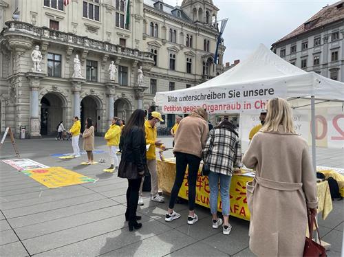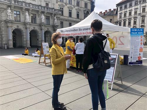 还有不少人对学炼法轮功表现出很大兴趣。一位路过的女士表示学员们炼功的场景“给人印象很深”。一位即将退休的女士询问了格拉茨市炼功点的信息。