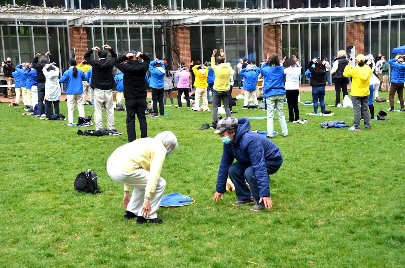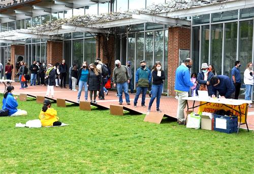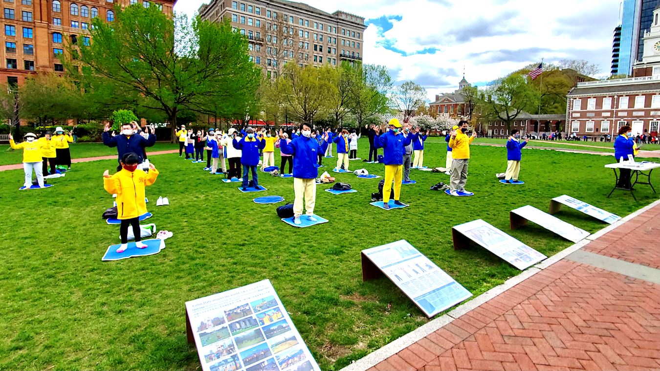 图1:大费城地区部份法轮功学员在美国国家独立历史公园的费城自由钟广场举办活动,纪念万名法轮功学员一九九九年四月二十五日在北京和平上访二十二周年。
