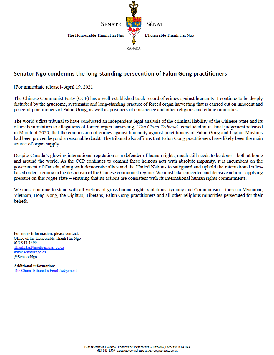 '图:加拿大参议员吴蓝海(Thanh Hai Ngo)在二零二一年的“四二五”前夕发表声明,支持法轮功学员,谴责中共迫害'