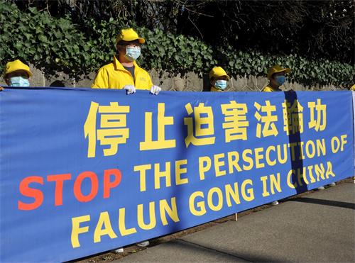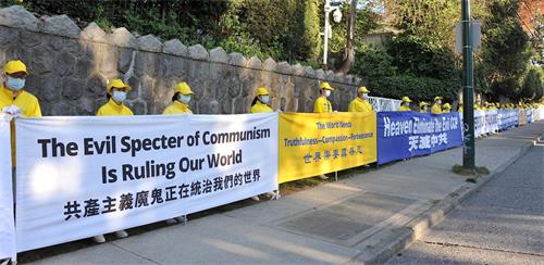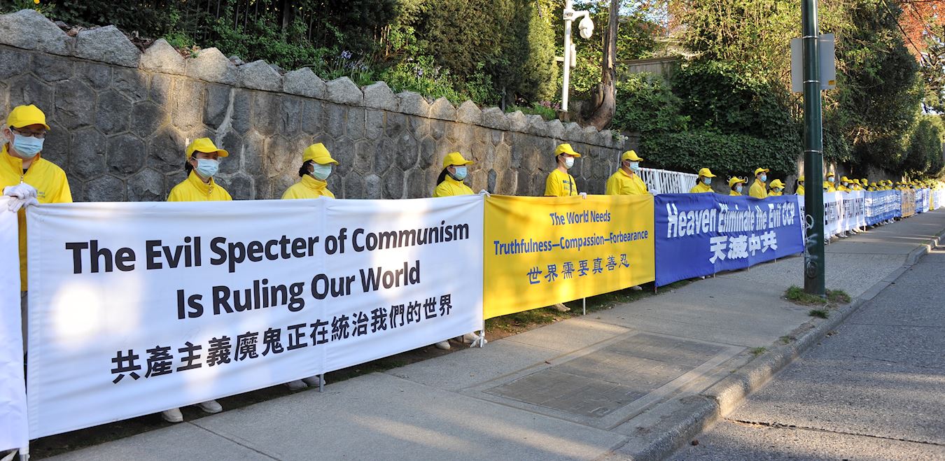 【明慧网二零二一年四月二十四日】(明慧温哥华记者站报道)二零二一年四月二十二日下午,加拿大温哥华部份法轮功学员在中领馆前,打着一面面横幅和平抗议,纪念二十二前的“四二五”上万名法轮功学员北京和平上访,呼吁停止迫害。开车经过的司机纷纷鸣笛表示支持,还有很多人竖起大拇指称赞。
