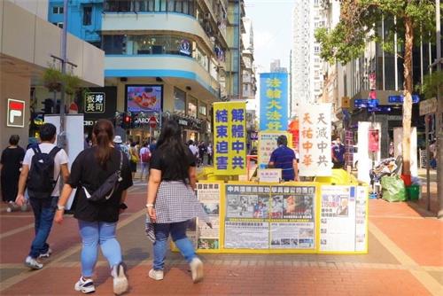 '图1~2:虽然多次遭到中共暴徒袭击,但香港法轮功学员没有退却,真相点一天都没有停止过。图为四月二十三日位于旺角豉油街的法轮功真相点。'