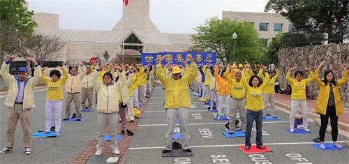 图4~5:二零二一年四月二十四日,美国首都地区部份法轮功学员在中共驻美大使馆前举行集会,纪念万名中国法轮功学员四·二五和平上访二十二周年。法轮功学员在集会后集体炼功。