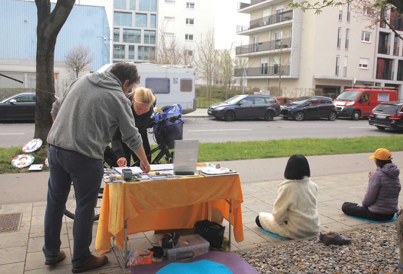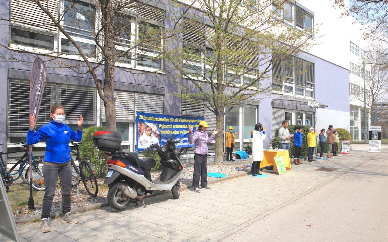 法轮功学员每周在中领馆前都有和平抗议活动。四月二十五日当天,慕尼黑十分晴朗,散步骑车的人比往常多。不少人接过学员递上的资料,有的马上签名声援法轮功学员反迫害。