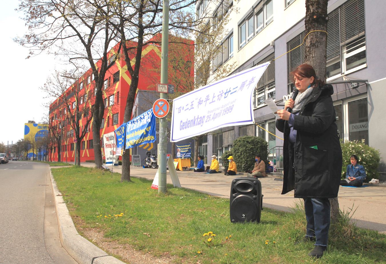 图3:法轮功学员宣读德国大论大法信息中心关于纪念“四·二五”和平上访二十二周年的公开信。