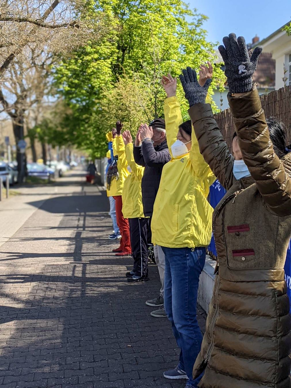 【明慧网二零二一年四月二十七日】(明慧德国记者站报道)为纪念万名法轮功学员“四·二五”和平上访二十二周年,呼吁制止中共迫害法轮功,德国法轮功学员分别于二零二一年四月二十二日、二十五日在慕尼黑中领馆前,和四月二十三日在法兰克福中领馆前进行和平抗议,得到当地民众支持。