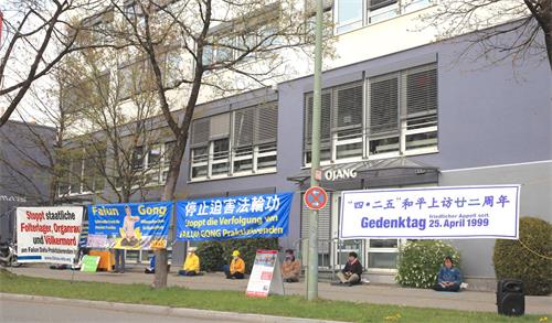 法轮功学员每周在中领馆前都有和平抗议活动。四月二十五日当天,慕尼黑十分晴朗,散步骑车的人比往常多。不少人接过学员递上的资料,有的马上签名声援法轮功学员反迫害。